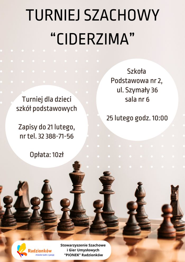 Zapraszamy na turniej szachowy "Ciderzima". Turniej odbędzie się we wtorek, 25 lutego br. o godzinie 10:00 w Szkole Podstawowej Nr 2 w Radzionkowie.