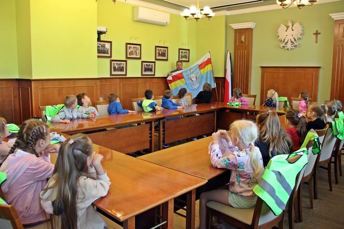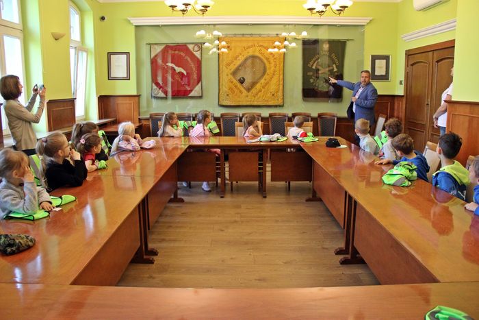 Na sali sesyjnej dzieci zaznajomiły się z symbolami Radzionkowa, a następnie zwiedziły gabinet Burmistrza Miasta Radzionków.