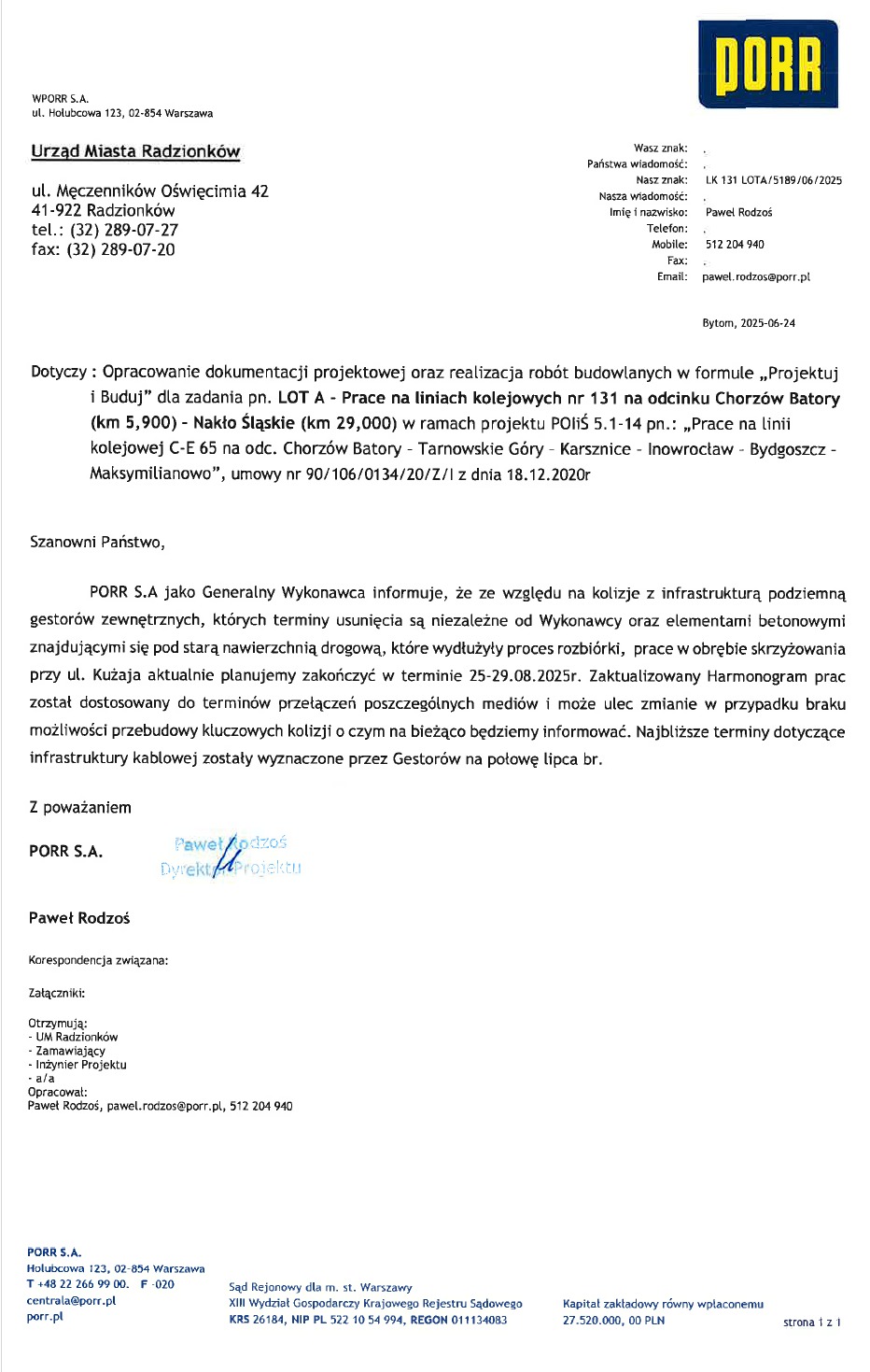 Do Urzędu Miasta Radzionków wpłynęło oficjalne pismo dotyczące przedłużenia prac remontowych na wiadukcie kolejowym przy ulicy Kużaja.
