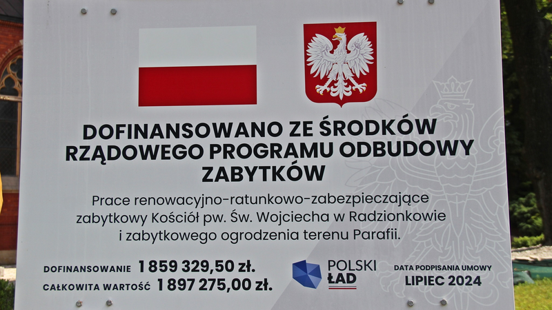 Przypomnijmy, że na wniosek Gminy Radzionków złożony w 2023 roku w programie „Rządowy Program Odbudowy Zabytków”, miasto pozyskało kwotę 1.859.329,50 zł co stanowiło 98% wartości prac objętych projektem i przeprowadzonych na terenie kościoła Św. Wojciecha. Wkład własny do projektu zapewniła Gmina Radzionków.