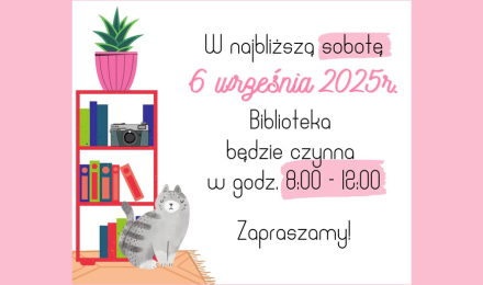 Miłośników książek zapraszamy w sobotę do Miejskiej Biblioteki Publicznej w godzinach od 8:00 do 12:00.