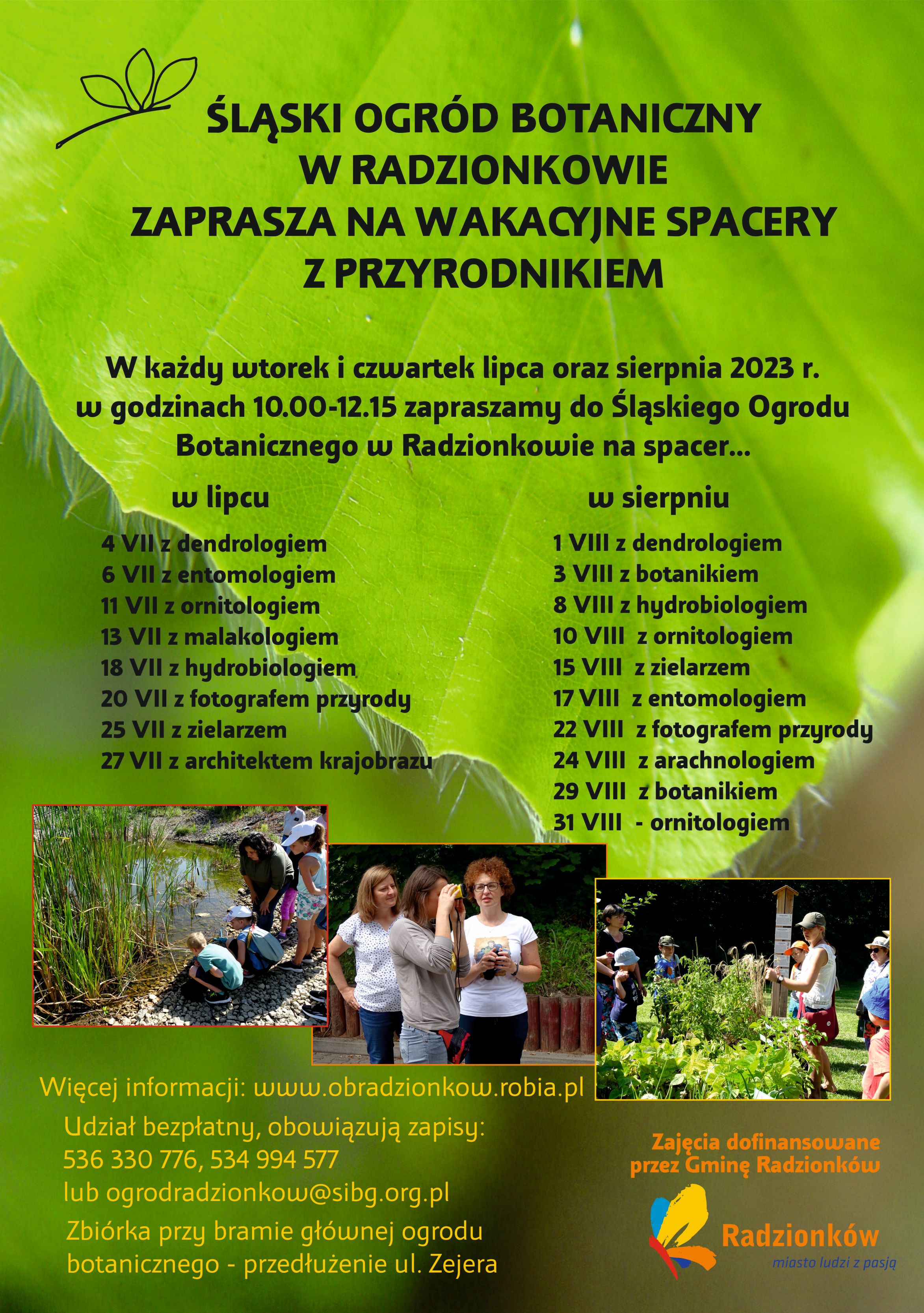 Śląski Ogród Botaniczny w Radzionkowie zaprasza w wakacyjne wtorki i czwartki na spacery przyrodnikiem. Zbiórka o godz. 10:00 przy bramie głównej do ogrodu botanicznego (przedłużenie ul. Zejera). Obowiązują zapisy: tel.: 536 330 776 lub e-mail: Ten adres pocztowy jest chroniony przed spamowaniem. Aby go zobaczyć, konieczne jest włączenie w przeglądarce obsługi JavaScript..